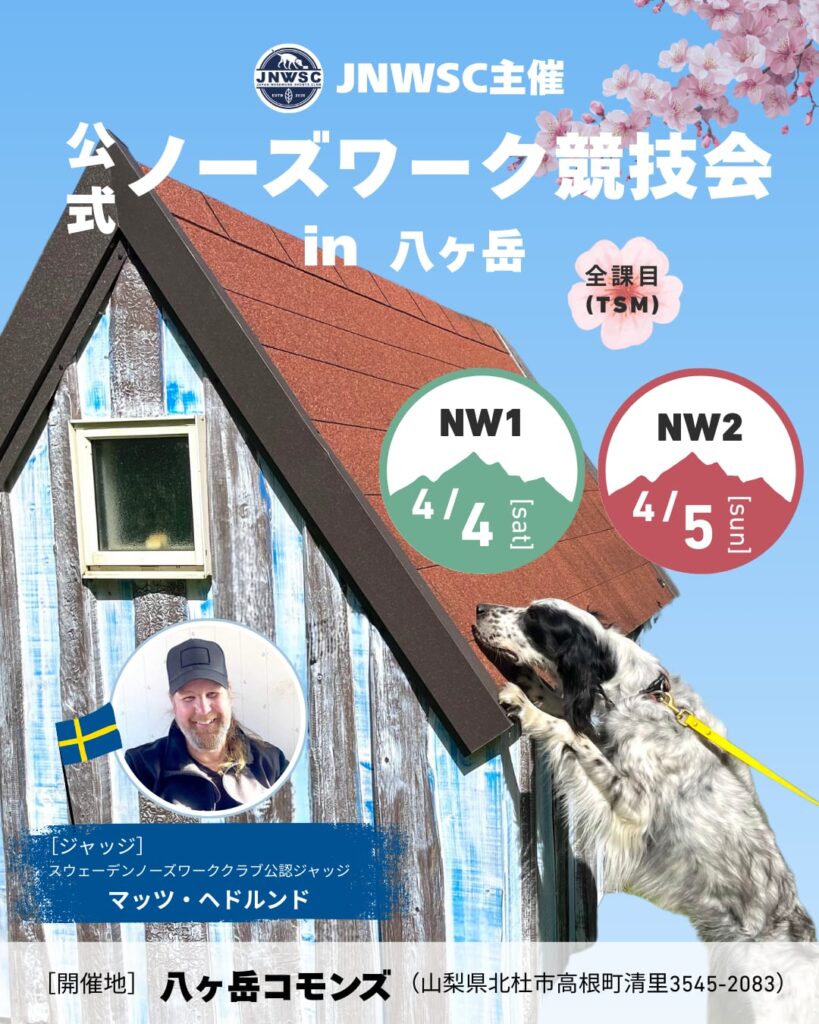 競技会タイトル:JNWSC主催 2026年4月 公式ノーズワーク競技会 in 八ヶ岳 NW2